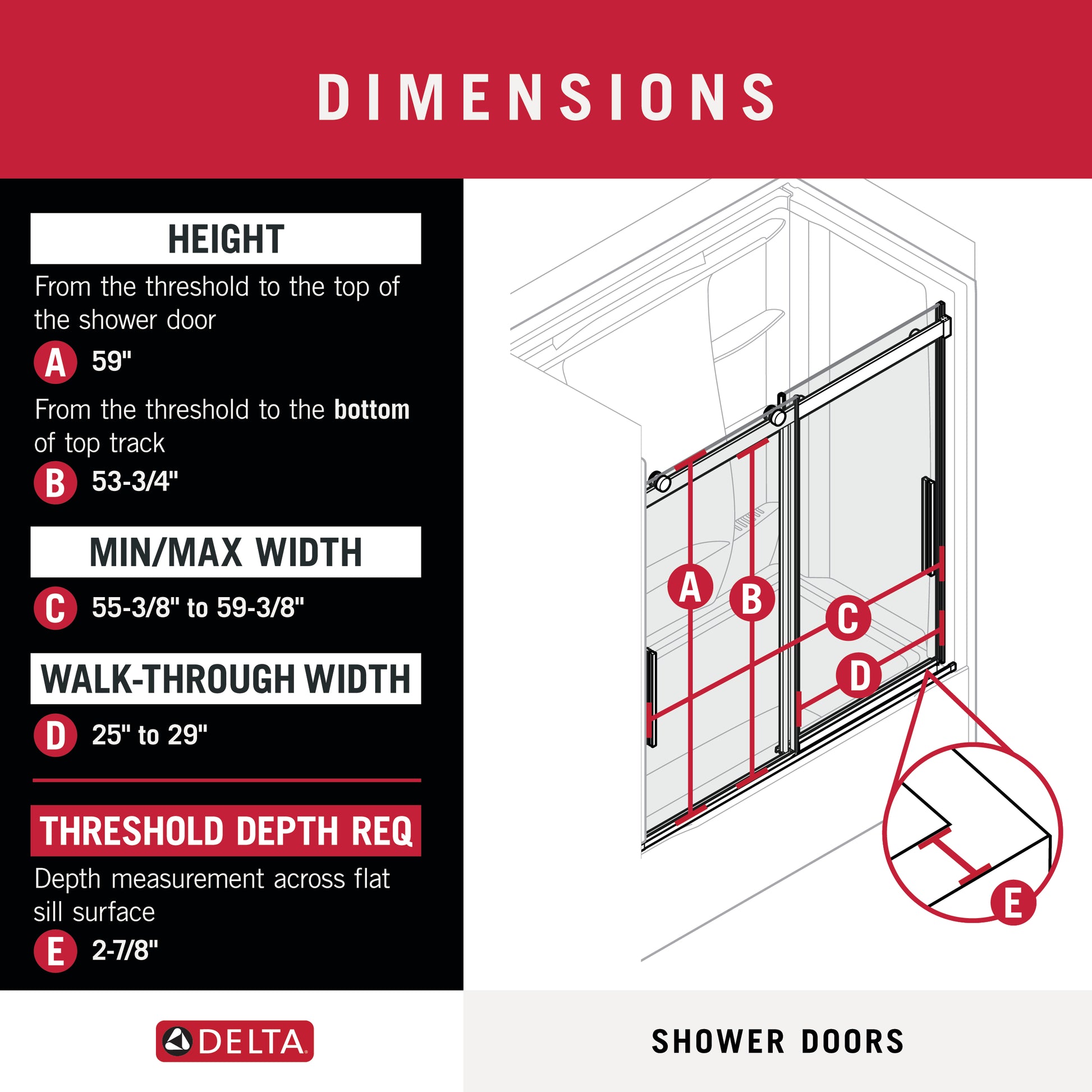 FIT: Requires opening width of 55-3/8 in. minimum to 59-3/8 in. maximum and 59 in. (150 cm) threshold to top of door; Offers walk-in width of 25 to 29 in. (64-74 cm), 53-3/4 in. height threshold to the bottom of the top track