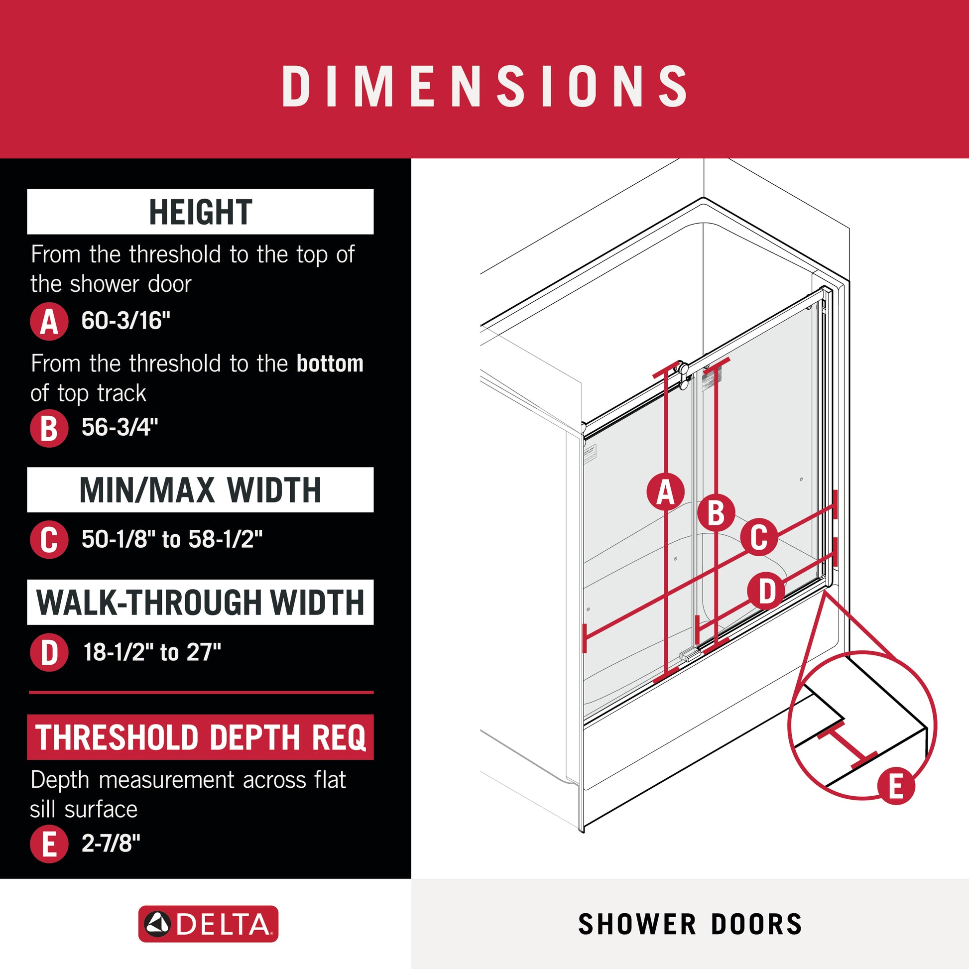 FIT: Requires opening width of 50-1/8 in. minimum to 58-1/2 in. maximum (127.3-148.6 cm) and 60-3/16 in. (152.9 cm) threshold to top of door; Offers walk-in width of 18-1/2 to 27 in. (47-69 cm), 56-3/4 in. height threshold to the bottom of the top track
