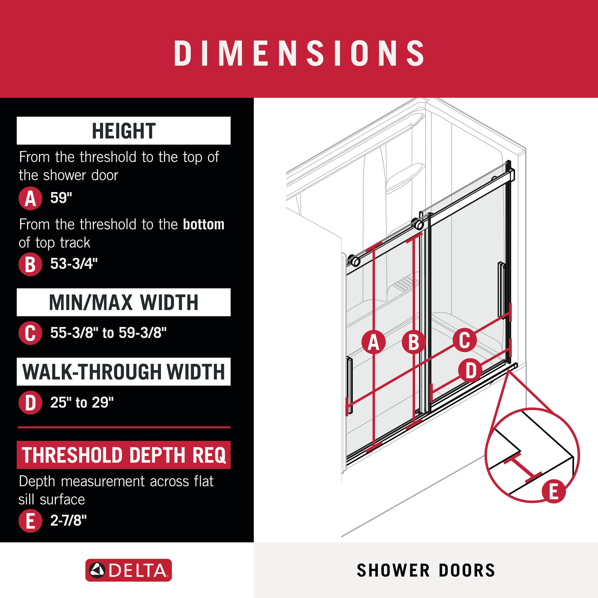 FIT: Requires opening width of 55-3/8 in. minimum to 59-3/8 in. maximum (140.7-150.8 cm) and 59 in. (149.9 cm) threshold to top of door; Offers walk-in width of 25 to 29 in (64-74 cm), 53-3/4 in. height threshold to the bottom of the top track