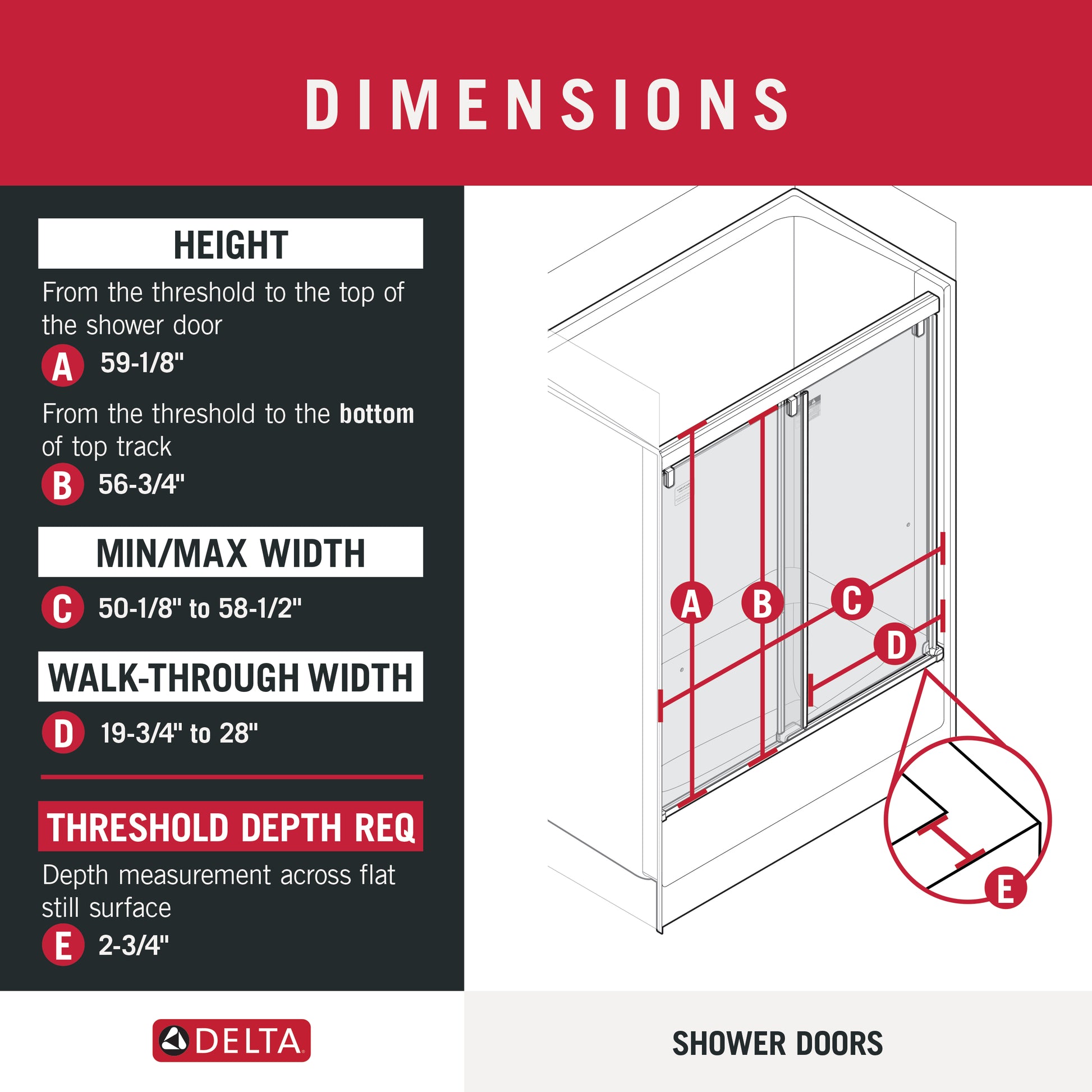 FIT: Requires opening width of 50-1/8 in. minimum to 58-1/2 in. maximum (127-149 cm), 59-1/8 in. (150.2 cm) threshold to top of door; Offers walk-in width of 19-3/4 to 28 in. (50-71 cm), 59-1/8 in. height threshold to the bottom of the top track